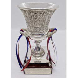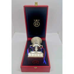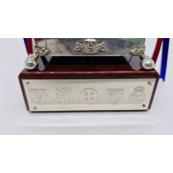 - Fabricado en alpaca con baño de plata, con peana cuadrada de madera caoba